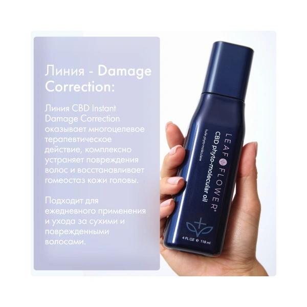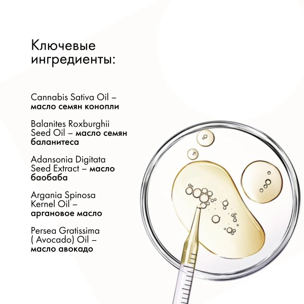 Фитомолекулярное масло интенсивно увлажняет волосы, восстанавливая их структуру изнутри и снаружи. Делает локоны эластичными, упругими и защищает от ломкости. Комплекс натуральных масел глубоко питает волосы, усиливает их блеск и предотвращает обезвоживание. Сквалан смягчает и укрепляет пряди, масло конопли придает упругость, а экстракт баобаба поддерживает эластичность кожи головы. Формула с CBD Corrective Complex улучшает качество волос и дарит им здоровый вид.
